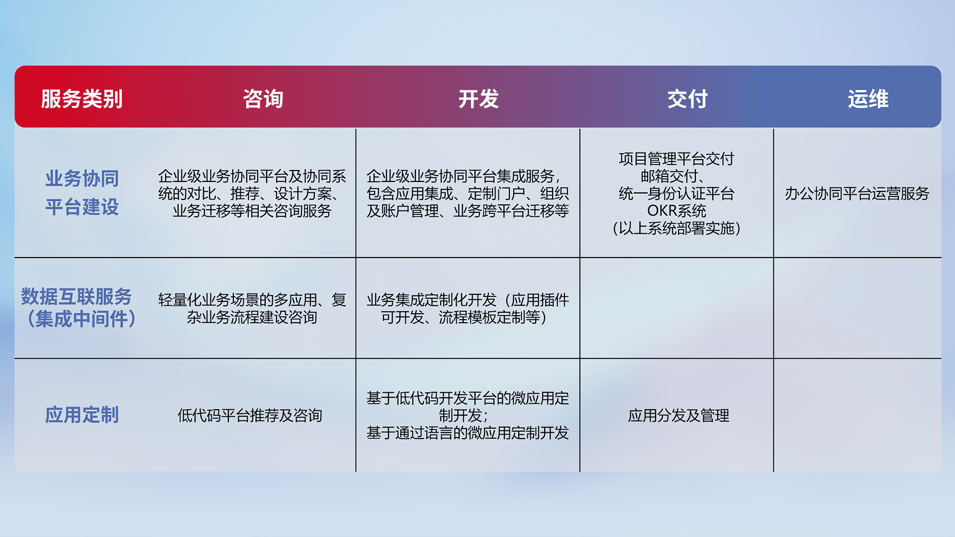 针对钉钉、、企微、、、、IDaas等平台级产品提供产品的规划、、、方案、、、交付、、定制化开发等服务,,,实现如统一协同办公、、智能客户服务、、、、混合会议管理、、、智能数据查询、、等业务场景,,实现数字化转型。。。。